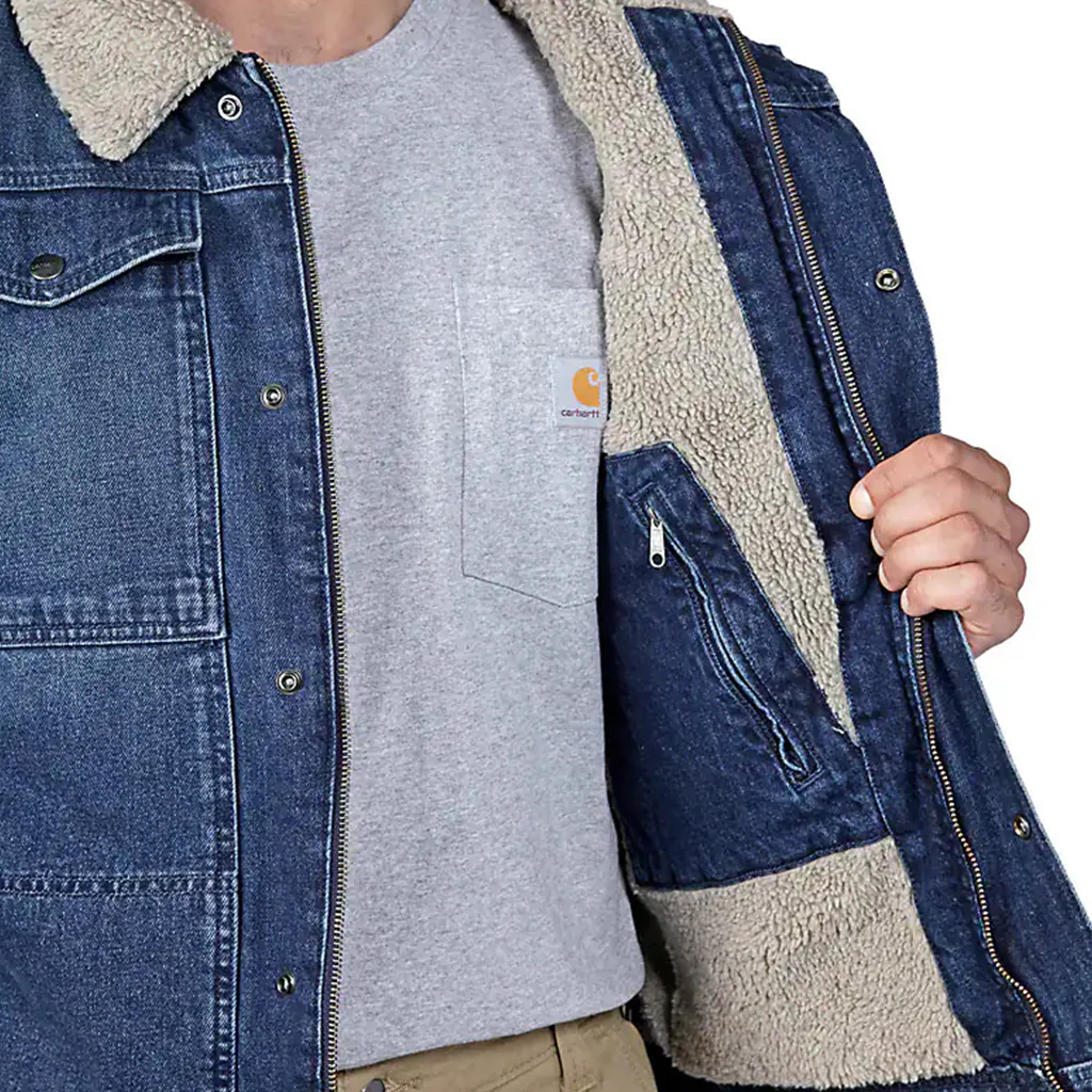 Cool-weather won't slow you down in this men's denim jacket. A relaxed fit and pleated back offer room to move while setting up equipment on the job or doing weekend chores. It's lined with sherpa fleece for added warmth. Pockets inside and out add plenty of storage.